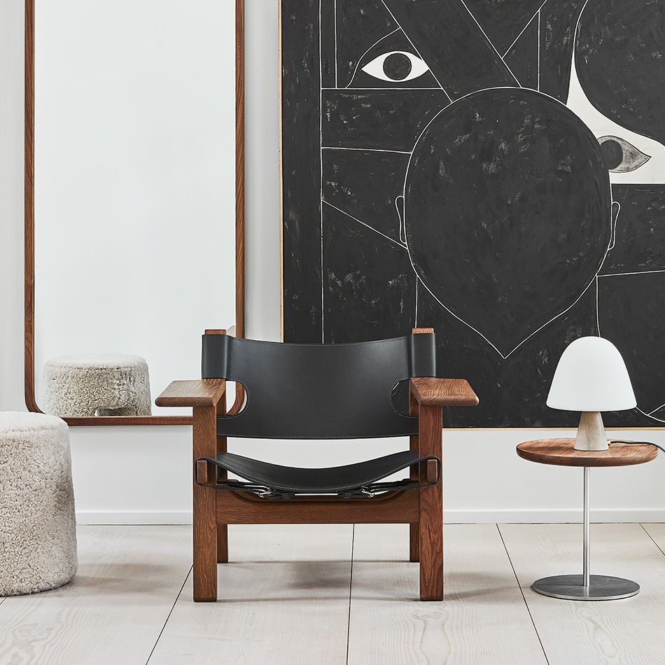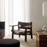 Spanish chair by Fredericia, with Mogensen expanded upon his work with solid oak and saddle leather. The chair was launched in 1958 as part of an innovative living space exhibition, in which all tables were removed from the floor to create an open living space.